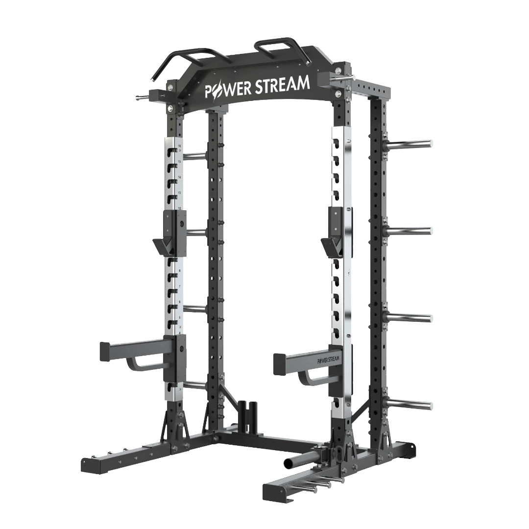 2 J Hooks, 2 Spotter arms, Olympic weight storage, 4 bar storage, Land mine, Band pegs (top & bottom), Power Stream name plate, Protective wear cover (outside)“knulled” pull up bar