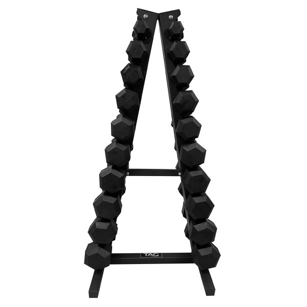 Product Description Tag Fitness HEX Vertical A-Frame Dumbbell Rack Cradles Molded to Protect Dumbbells Holds 10 Pairs (5-50lbs) Holds Hex Dumbbells 550-Pound Weight Limit Frame: Black 30” W x 60” H x 24.25”D Dumbbells sold separately.